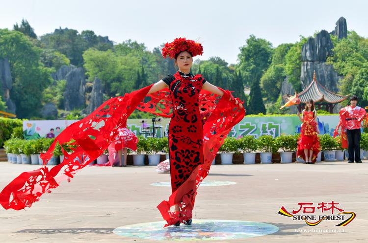 活动开场,汉服展演率先登场。9点30分,身着华丽汉服的队伍从石林风景区电瓶车游客下车点出发,途径自然遗产标志石,一路巡游至日月广场,一招一式尽显华夏文明礼仪之美。除此之外,来自云南林职院大学生艺术团的同学们巧妙把握剪纸的灵感,将诗词以及民俗风情等元素融入服装设计,为在场游客展示了他们天马行空的创意和别出心裁的灵感。