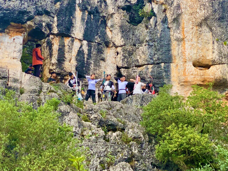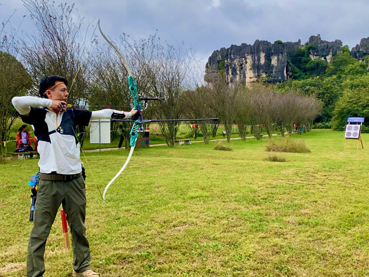 组委会负责人表示:“本届赛事规格升级,设反曲弓、复合弓、传统弓、光弓四大弓种,吸引了来自全国180名顶尖射手同场竞技。组委会优化赛制玩法,在乃古石林嶙峋的喀斯特奇石间布设12个靶位,半数靶位不标注射距,选手需在石景与花海交织的环境中自主判断距离、调整姿态,高低错落的靶位对参赛选手的专业素质和体力都充满了考验,比赛颇具观赏性,而这也正是原野射箭的魅力所在。”