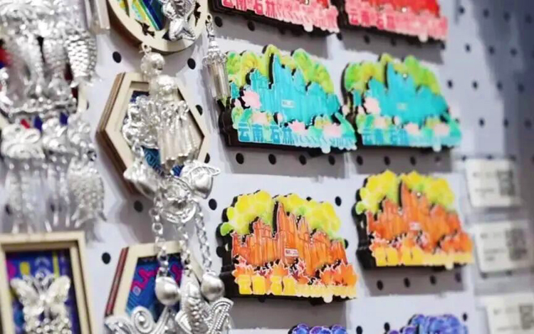 云南九溢泽科技有限公司运营负责人宋美芳介绍:“我们拥有超过40款不同种类产品,款式多达400余种,包括冰箱贴、明信片、非遗摆件、文具以及公仔玩偶等。特别是‘阿诗玛’IP金属冰箱贴,仅此一款产品一年内销售量就超过了10万件,所有文创产品总销售额达到了400多万元。”