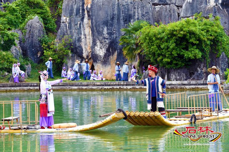 10月1日-8日,景區再現《阿詩瑪》經典。蓮花池邊,演員身著撒尼族服飾,在波光粼粼的池畔與木筏上演繹“阿詩瑪和阿黑哥對歌定情”,悠揚歌聲搭配實景,帶你沉浸式回味電影記憶;日月廣場化身歡樂舞台,精彩歌舞表演和全民大聯歡輪番上演,感受彝族撒尼人的熱情與活力。