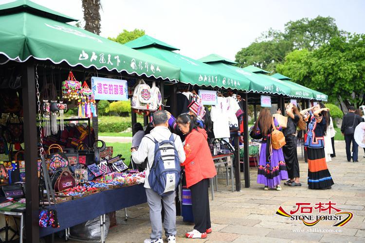 “彝韻共亯,非遺共舞”阿詩瑪非遺互動展演同步在石林勝景、且住為佳、劍峰池等地開展,彝鄉三弦舞熱烈奔放,刺繡工坊針法精妙。 遊客不僅能近距離觀賞原汁原味的非遺表演,更能親手體驗,感受彝家文化的深厚底蘊。 迎賓廣場的“彝韻匠心,市聚石林”非遺集市,展出精美彝家服飾,讓你把石林文化穿在身上、帶回家中。