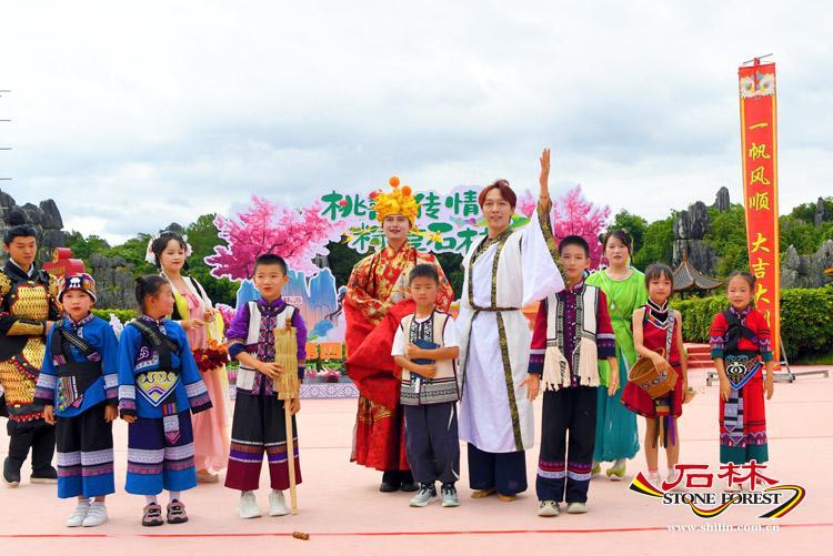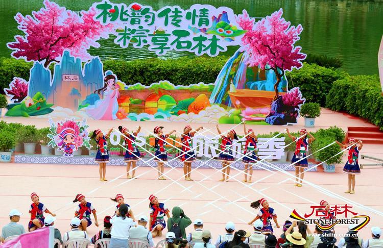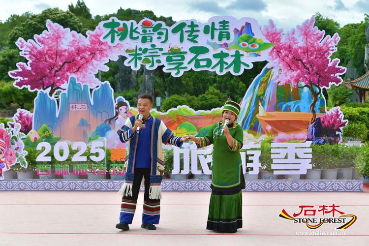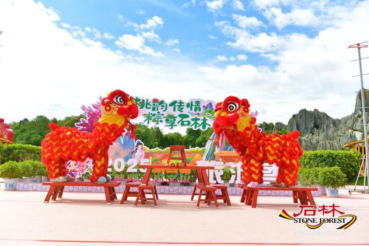 為了營造濃厚的節日氛圍,活動現場還進行了精心佈置。 日月廣場設定了“桃韻傳情・粽享石林”主題背景,同時設計製作了特色手持拍照板,民俗演員還會與遊客合影,並提供特色拍照道具,大大新增了遊客的參與感和互動性。