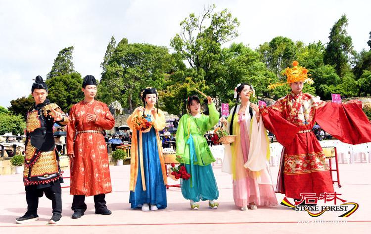 活動首日,開幕式成為端午假期精彩的開端,漢服歌舞翩躚,嗩呐獅舞盡顯非遺魅力,遊客觀眾參與跳月民俗活動,沉浸式感受著石林風情。 “彝韻重現,光影流年”阿詩瑪生活片段展演,民俗大聯歡、電影對歌情景再現、沉浸式民俗接親表演輪番上演。 遊客不僅可以近距離欣賞,還能親身參與其中,深度體驗非遺文化的魅力。 此外,在景區迎賓廣場設定的“彝韻匠心,市聚石林”阿詩瑪非遺集市,集中展示了阿詩瑪故鄉的特色產品,遊客們穿梭其中,挑選著獨具特色的紀念品,將石林的美好回憶定格在一件件精美的紀念品中。