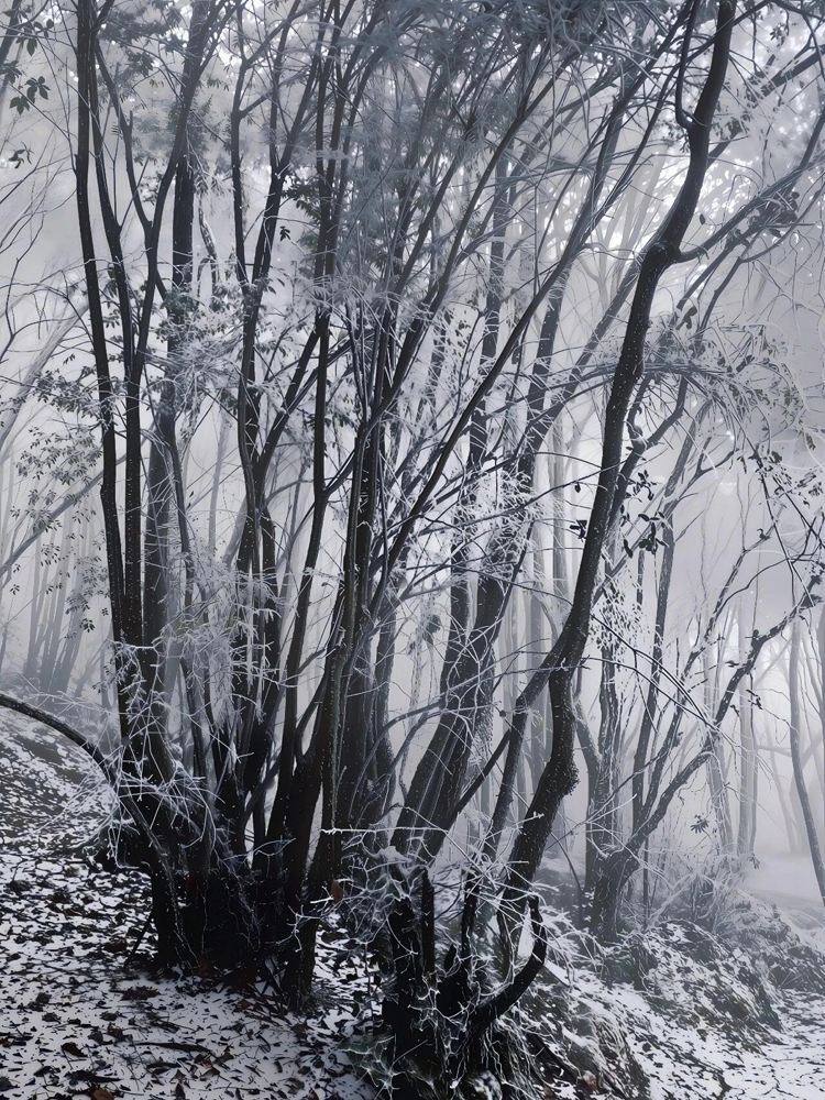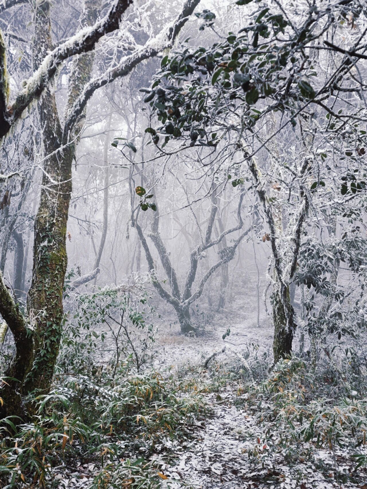 受寒潮天气影响,1月7日,石林县圭山国家森林公园迎来2026年首场雾凇景观。一夜之间,漫山草木皆换银装:松针凝霜成簇,似缀满细碎的银花却隐在雾中;灌木裹晶如球,宛若蓬松的白玉珊瑚在雾霭中若隐若现;就连低矮的蕨类植物,也被一层薄凇轻轻覆盖,叶片纹路在朦胧雾气里愈发柔和。琼枝玉树相映成趣,原本苍翠的山林换上蓬松柔软的银白盛装,冰晶在枝叶间错落分布,云雾未散时,从雾缝中瞥见零星银辉,宛如隐匿在森林里的神秘冰雪秘境。