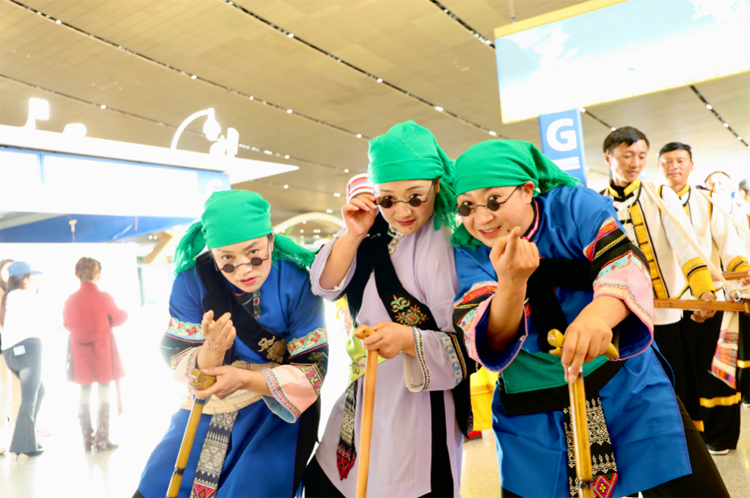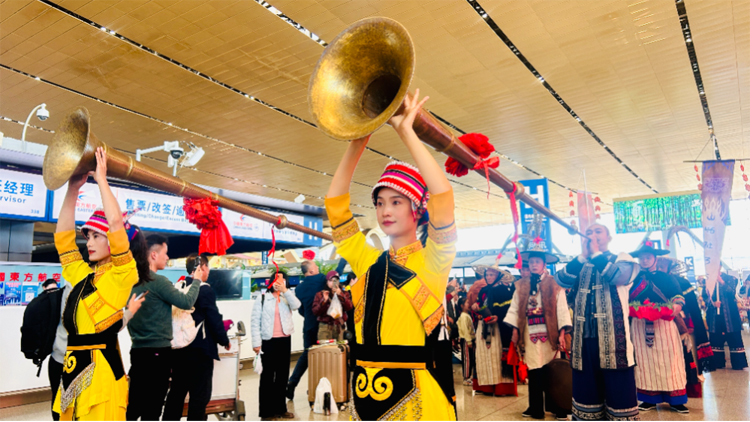 在昆明长水国际机场,石林以一场沉浸式文化演出,诚邀八方来客。彝族大三弦舞、过山号等表演点燃现场氛围,特色巡游、民族文化展示及特产文创吸引众多旅客驻足互动。来自马来西亚、蒙古等地的游客热情参与到现场活动中,沉浸式解锁石林独有的民族文化风情。