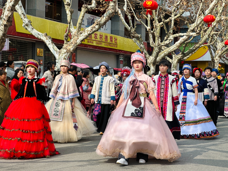 县城街巷处处洋溢着热闹年味,一场全民共享的文化狂欢精彩上演。大年初一的“欢欢喜喜过大年”群众文化游演,堪称视觉盛宴:七辆马年主题特色花车沿街巡游,幸运游客可搭乘花车感受欢呼与掌声;舞龙舞狮翻腾跳跃,过山号雄浑嘹亮,大三弦旋律悠扬,民俗方阵一路欢歌,穿越双龙广场、阿诗玛环岛等核心路段,整个县城都沉浸在欢乐海洋。