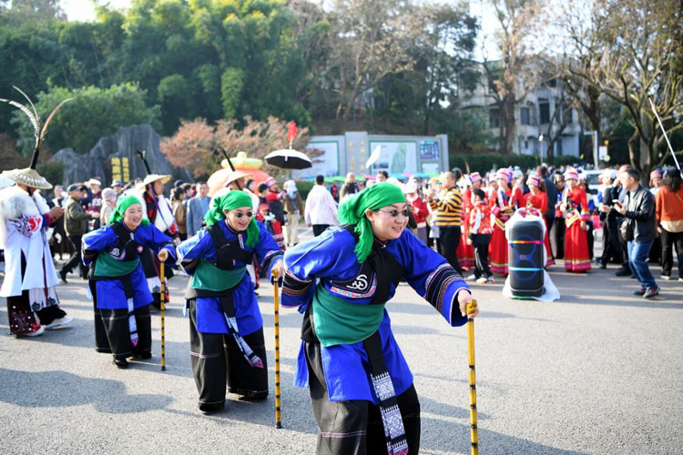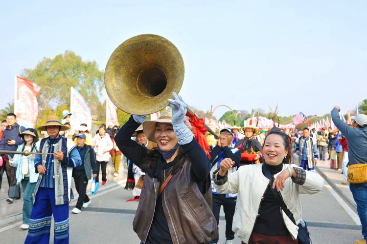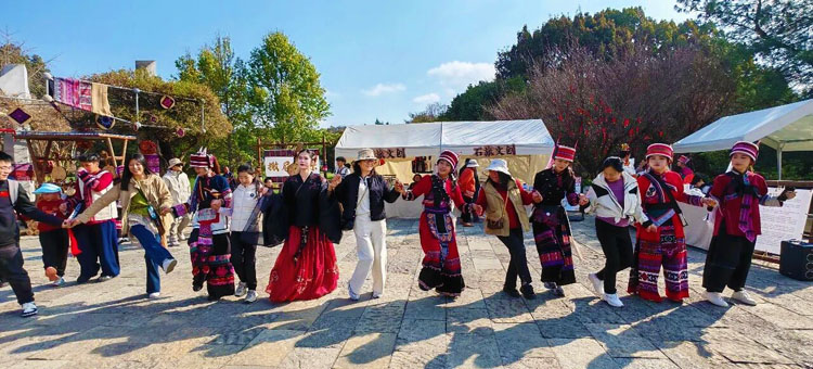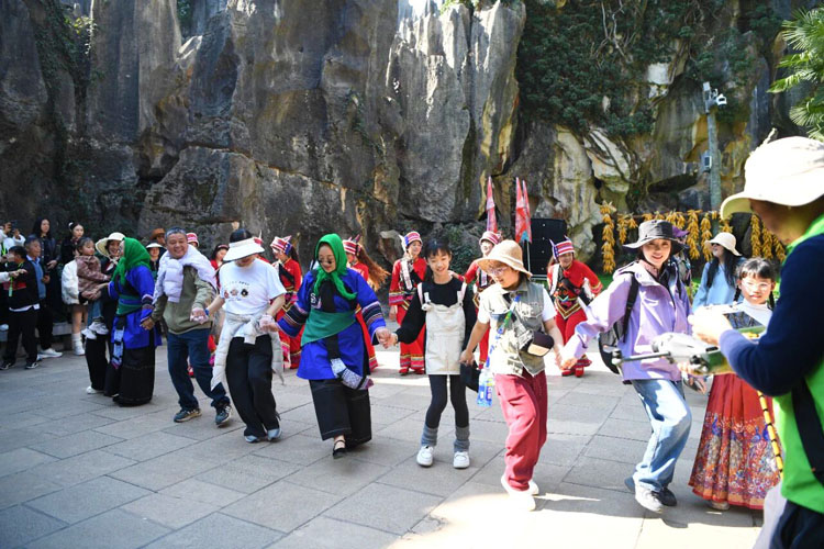 每日清晨,金马送福迎宾巡游准时开启,身着盛装的阿诗玛、阿黑哥载歌载舞,过山号与大三弦声交织,游客纷纷驻足合影、跟随巡游队伍沾取新春福气,快门声此起彼伏。天然舞场上,滇风打跳互动秀氛围感拉满,男女老少踊跃加入,跟着节奏尽情舒展,欢声笑语回荡在石峰之间。