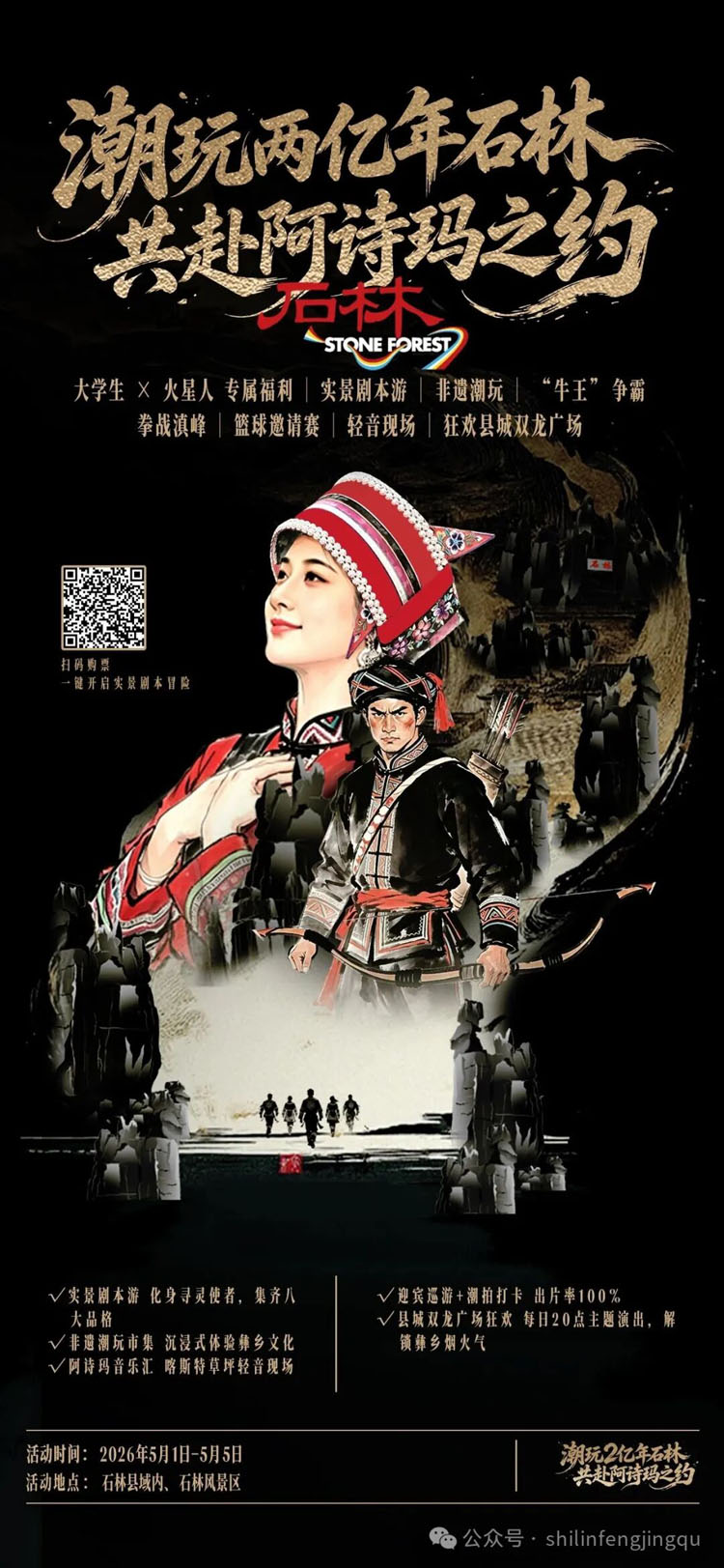 5月1日上午10点,石林景区日月广场将迎来2026第五届石林阿诗玛文化旅游季开幕式,这场仪式感拉满的盛典,绝对不能错过!